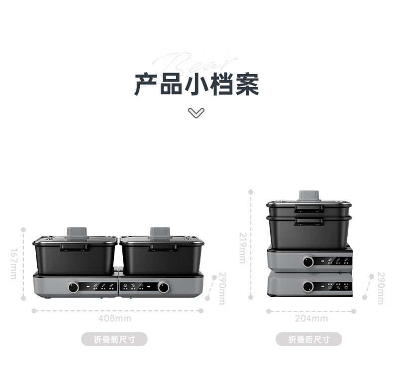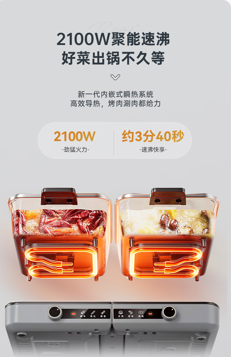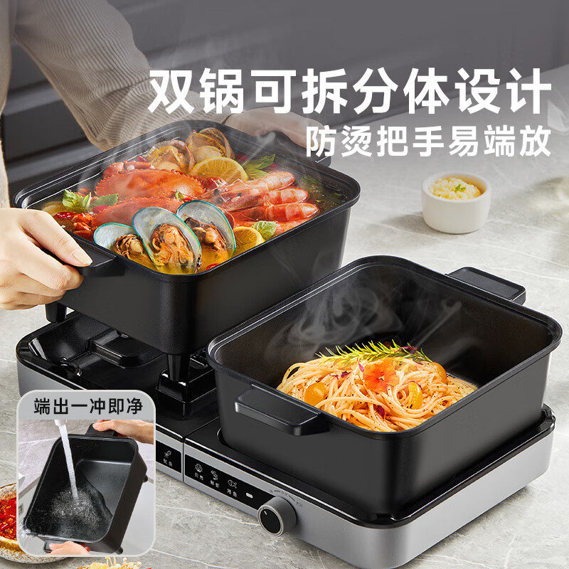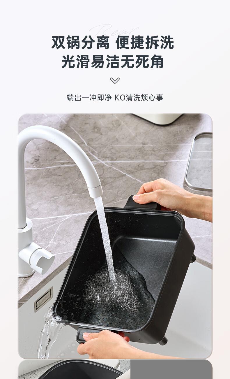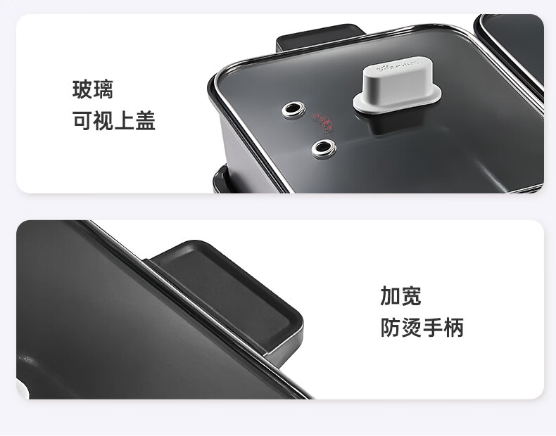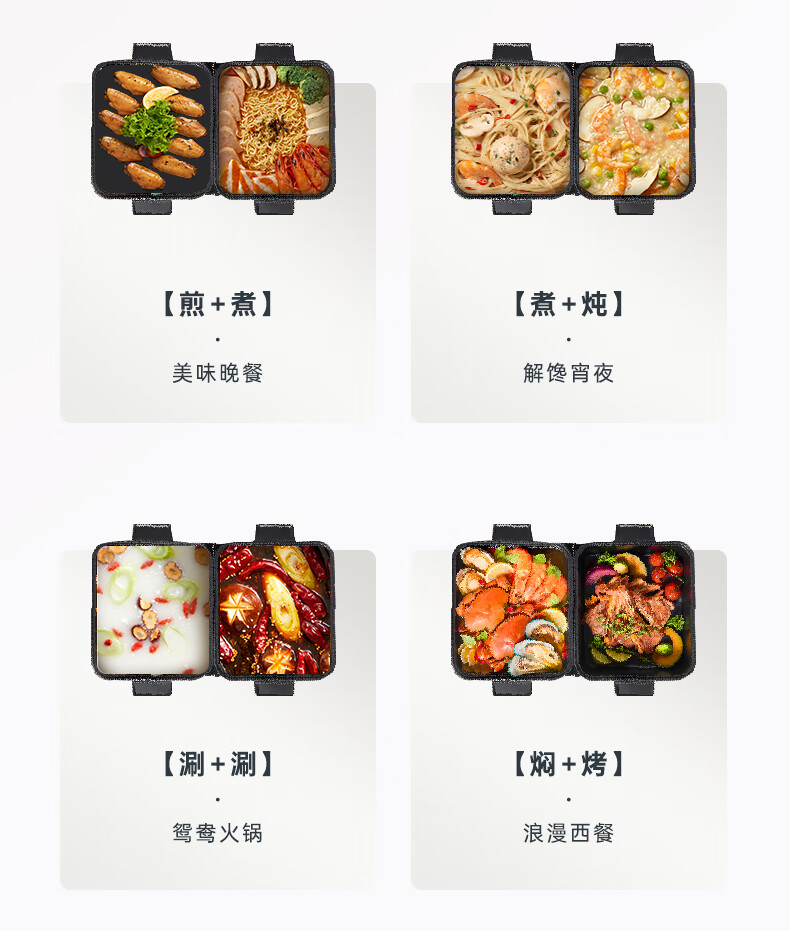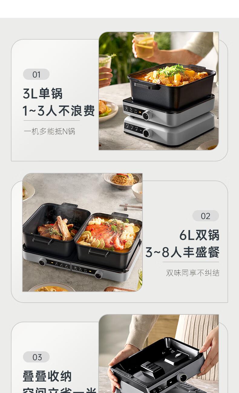 容量 6L 额定功率 2100W 产品重量 4kg 包装尺寸 322*255*380mm 1.容量6L(单锅容量3升) 2.额定功率2100W(单边功率1050W,单边小火功率525W) 3.内胆材质为304不锈钢 4.锅身材质为铝合金+特氟龙,主机本体材质为塑料PP,提手材质为PC+ABS