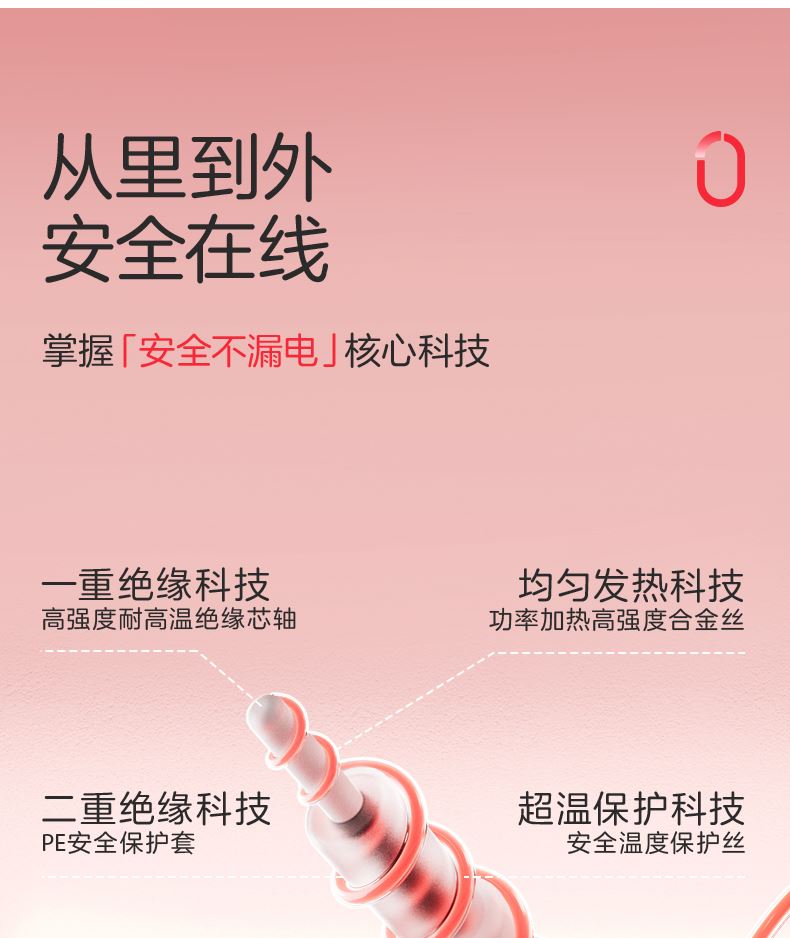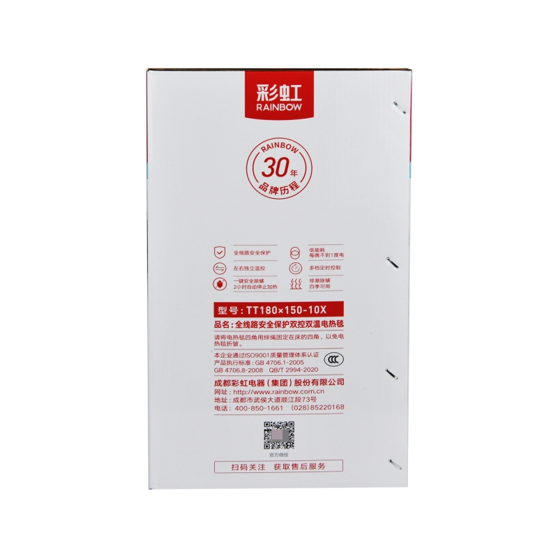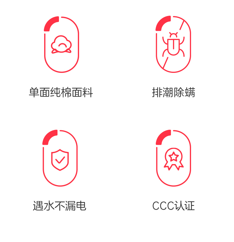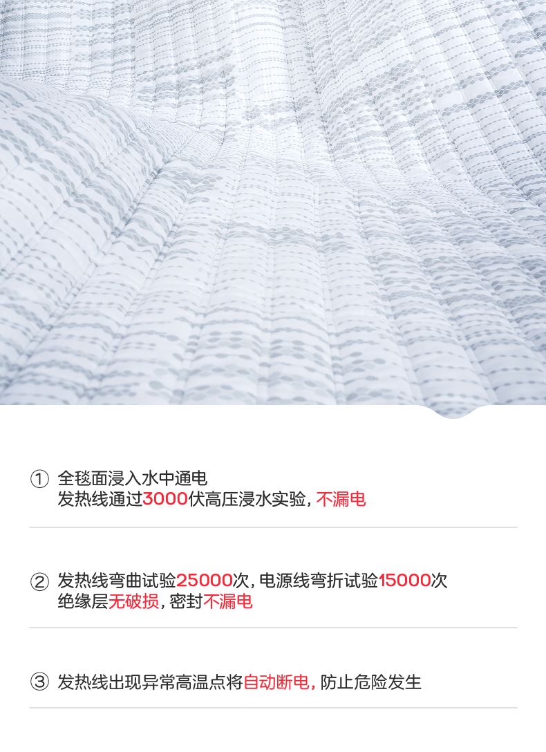 参数: 型号:TT180×150-10X 功率:120W 功能:多挡调节,一键除螨,排潮除湿。 开关:双控双温,可定时。 面料:单面纯棉、单面化纤 包装:彩盒 卖点: 1、全线路安全保护调温电热毯,多档调温,定时,遇水遇尿不漏电 2、纯棉绗棉加厚面料,舒适透气 3、采用双层螺旋发热线和特别安全保护控制器,实现高温断电保护 4、排潮除螨,四季可用,低能耗,每晚不到一度电!
